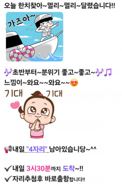 ●●왕 한 치 출 조●●선비:12만원출항:오후3시~3시30분(상황에따라 변동될수있음) ●출항10분전 자리추첨●추첨시간까지 도착못하실경우선택권없이 빈자리가 자기자리입니다~!!1인1석 지정석 널널한잠자리준비완료~!!●입금계좌(임*진)●수협 0001-8780-7720(선입금확인후 예약완료)●쿨러42이하로가져오세요●(대장쿨러/피크닉쿨러사절) ☆얼음드립니다☆저녁식사.음료수.생수.커피.컵라면.즉석라면 "서비스로제공"'진해뽀빠이피싱' 밴드로 초대합니다."아래 링크를 눌러 들어오세요.https://band.us/n/a6a591Tcq5D6v=== 진해 뽀빠이피싱 예약안내 ===예약문의 : 010-8780-7720오시는길 : 경남 창원시 진해구 진희로 36 (진해카페리선착장)홈페이지 : http://popeye.sunsang24.com/