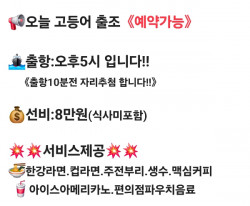 ●●왕 한 치 출 조●●선비:12만원출항:오후3시~3시30분(상황에따라 변동될수있음) ●출항10분전 자리추첨●추첨시간까지 도착못하실경우선택권없이빈자리가 자기자리입니다~!!1인1석 지정석 널널한잠자리준비완료~!!●입금계좌(임*진)●수협 0001-8780-7720(선입금확인후 예약완료)●쿨러42이하로가져오세요●(대장쿨러/피크닉쿨러사절) ☆얼음드립니다☆저녁식사.음료수.생수.커피.컵라면.즉석라면"서비스로제공"'진해뽀빠이피싱' 밴드로 초대합니다."아래 링크를 눌러 들어오세요.https://band.us/n/a6a591Tcq5D6v=== 진해 뽀빠이피싱 예약안내 ===예약문의 : 010-8780-7720오시는길 : 경남 창원시 진해구 진희로 36 (진해카페리선착장)홈페이지 : http://popeye.sunsang24.com/